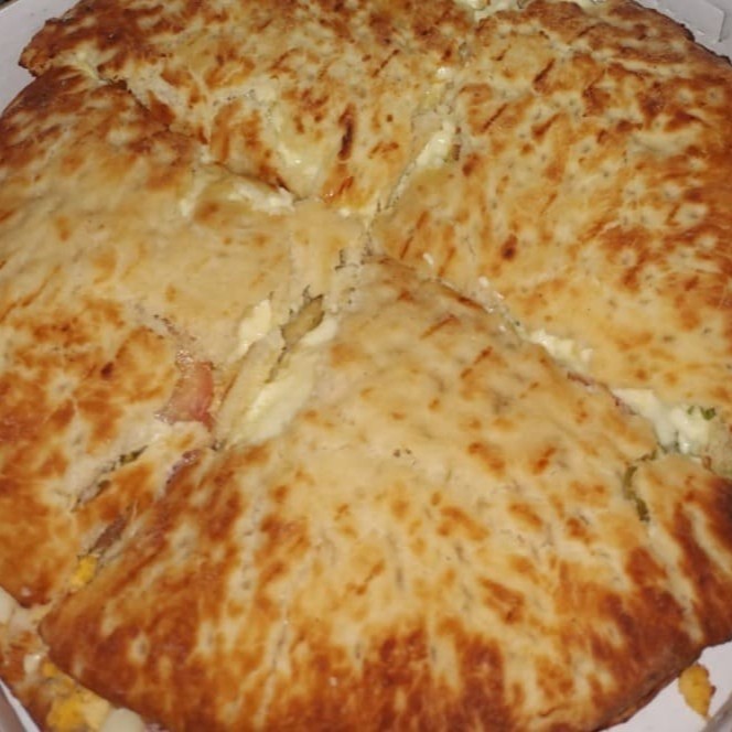 Massa artesanal, molho de tomate, em uma metade mussarela derretida com rodelas de tomate, na outra metade calabresa fatiada com cebola, azeitonas e orégano.