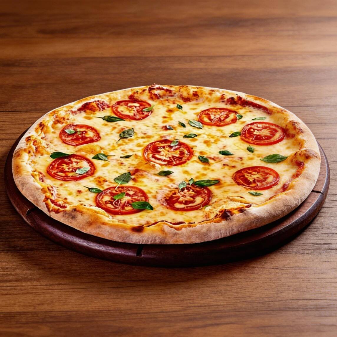 (Pizza grande 8 pedaços) Massa artesanal , molho de tomate fresco, queijo mussarela, tomate e manjericão