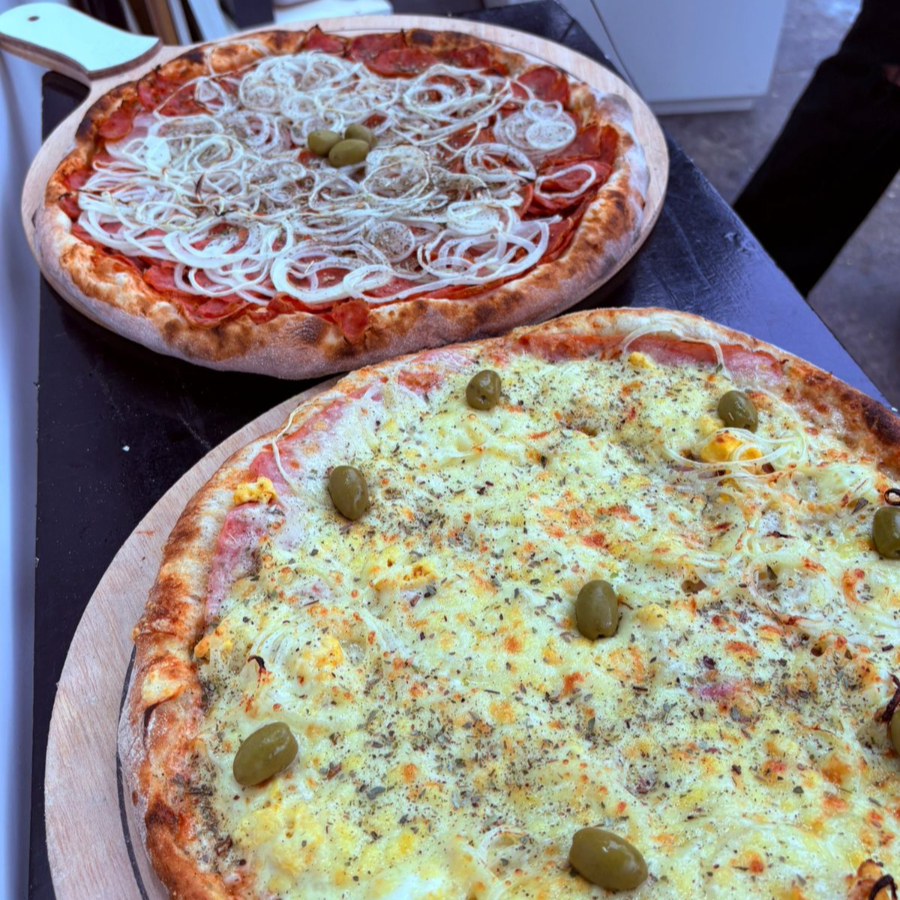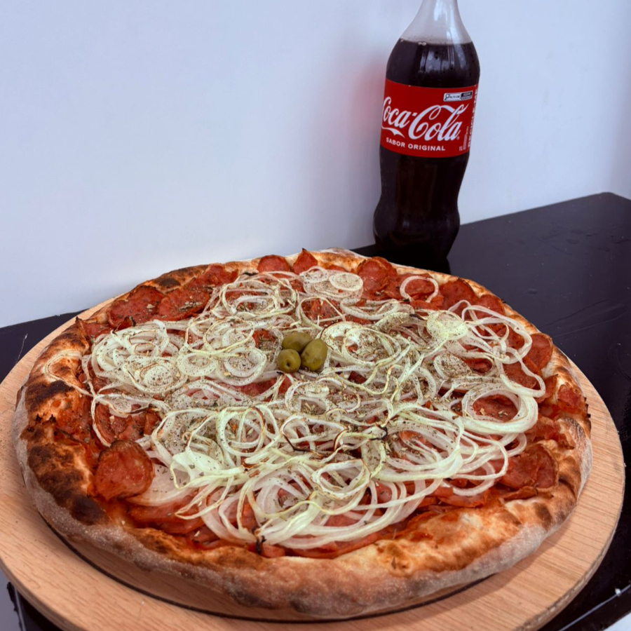 (Pizza grande 8 pedaços) Massa artesanal , molho de tomate fresco, calabresa, cebola e mussarela