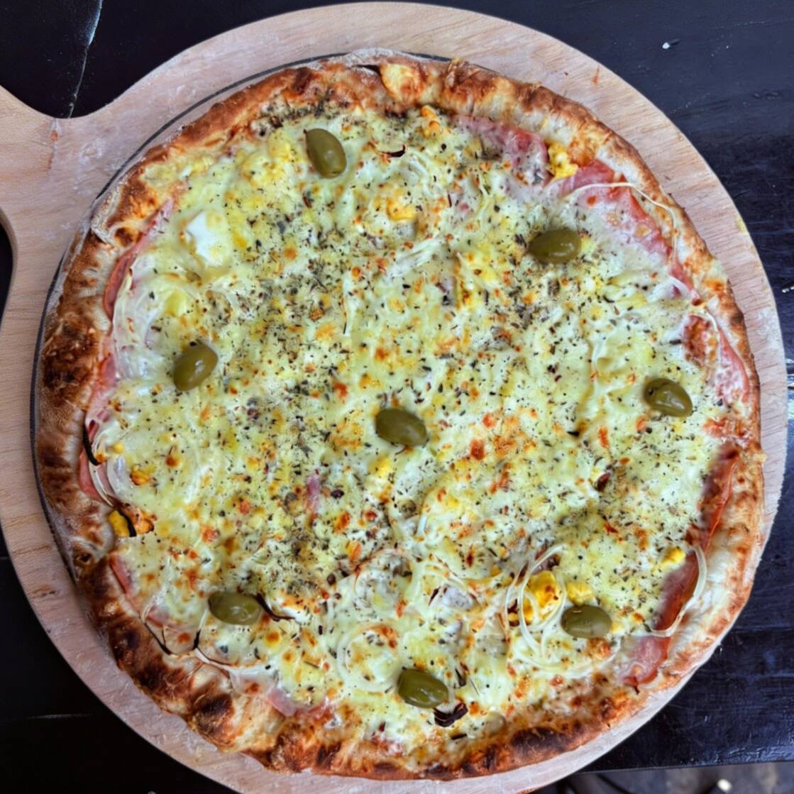 (Pizza grande 8 pedaços) Massa artesanal , molho de tomate fresco, presunto, ovos, cebola e queijo mussarela
