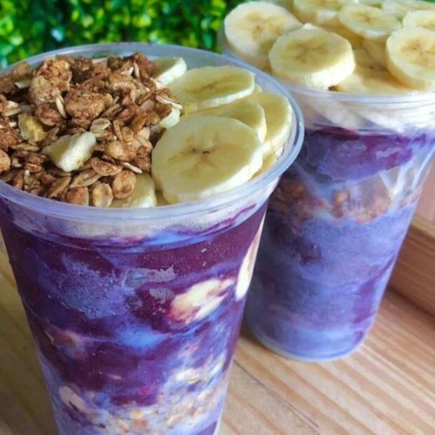 Pote de Açaí 750ml. Como seu pote será montado: Acompanhamentos e Frutas em cima Obs:Os. complementos não são enviados separadamente