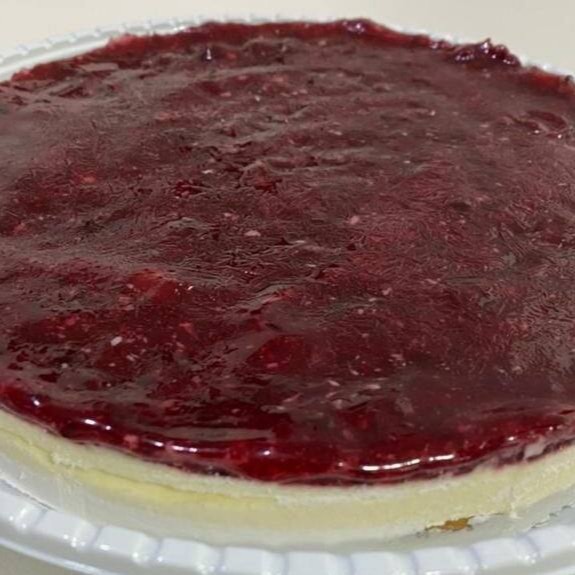 Torta c/ base de red velvet e iogurte coberta c/ frutas vermelhas.