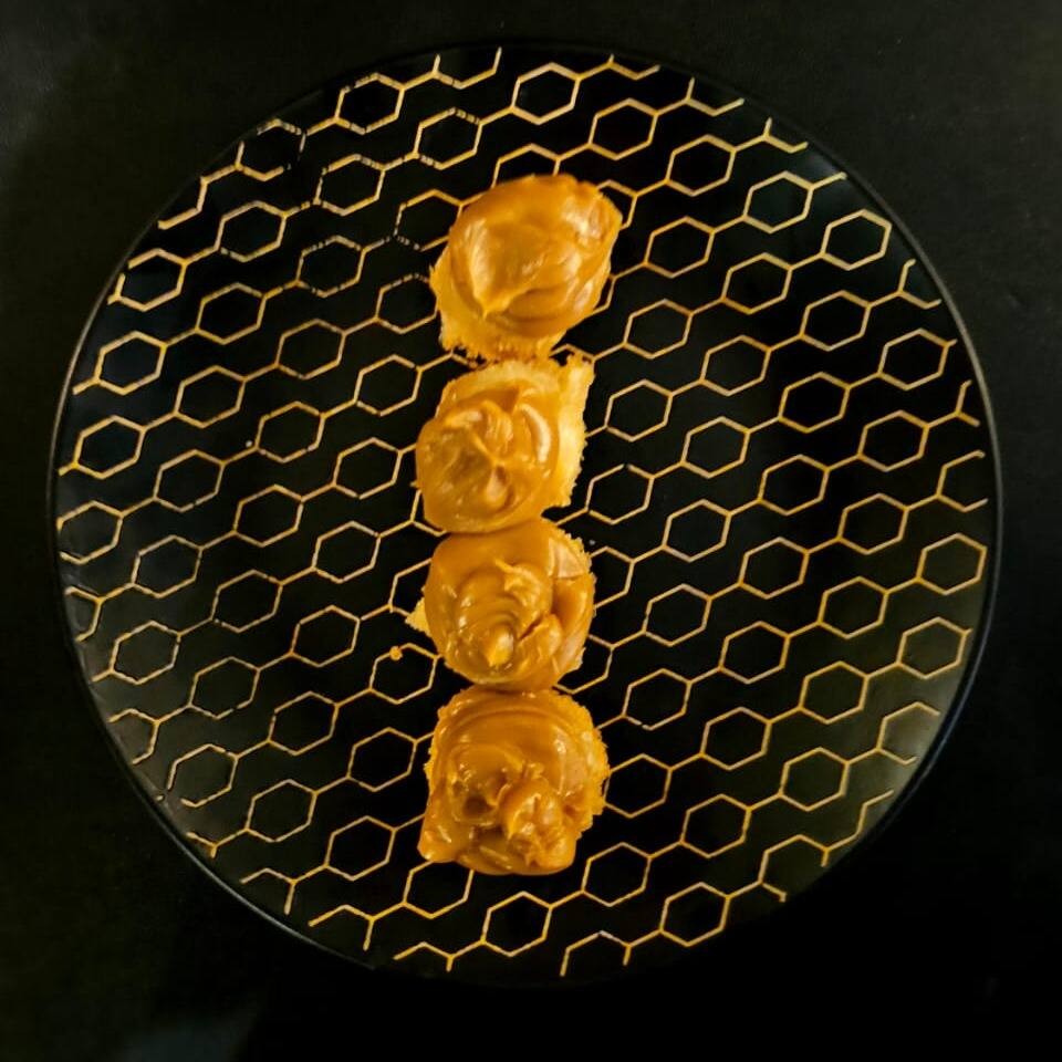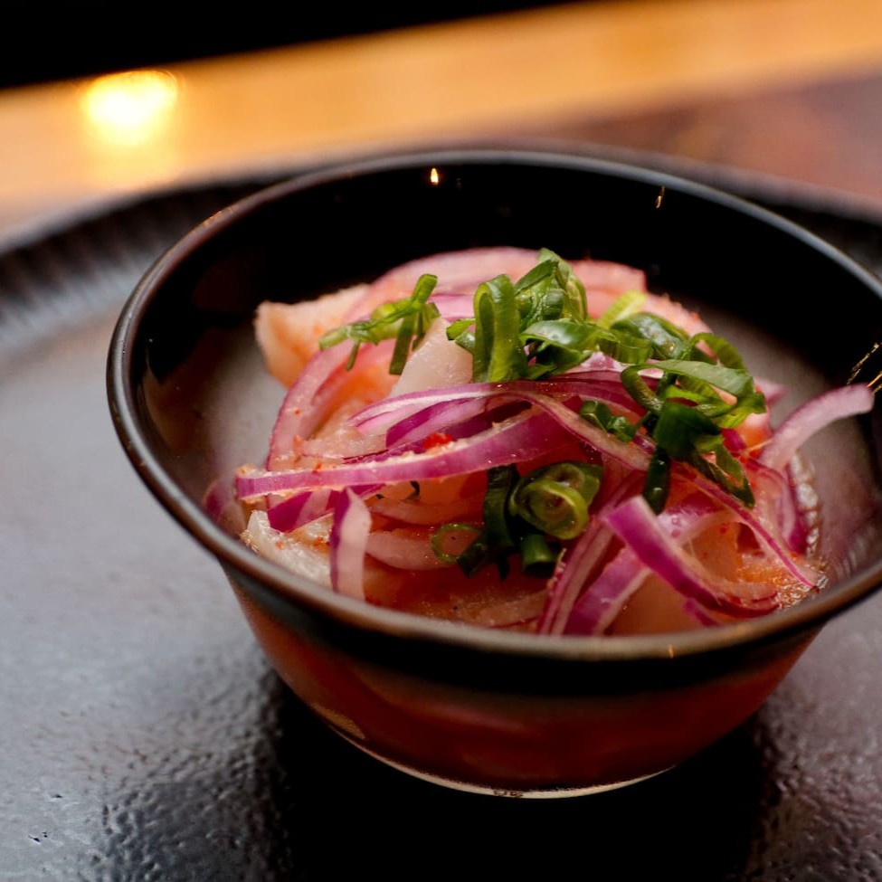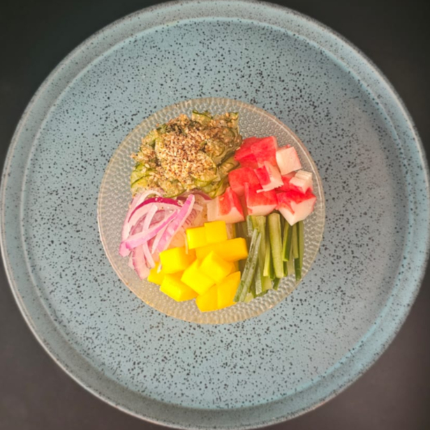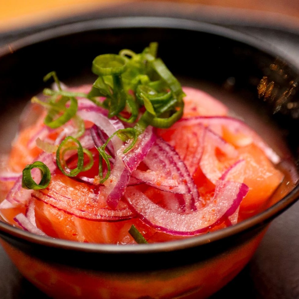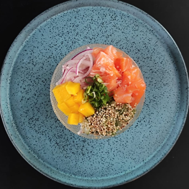 SHARI (ARROZ JAPONÊS TEMPERADO C/ MOLHO SÚ), SALMÃO CRU EM CUBOS, CEBOLA ROXA, MANGA, SUNOMONO, GERGELIM, CEBOLINHA, AZEITE TRUFADO E FLOR DE SAL