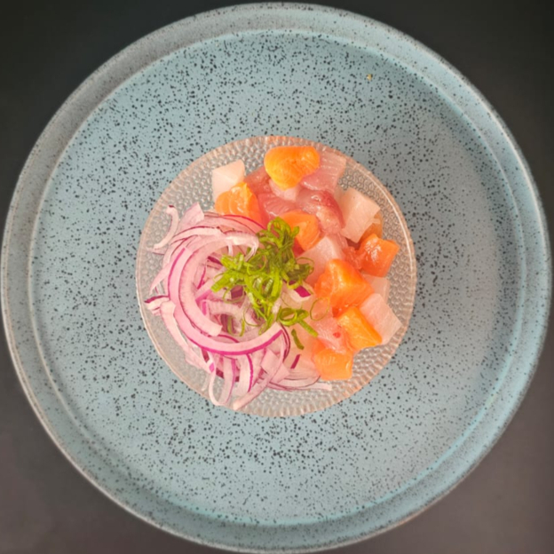 SHARI (ARROZ JAPONÊS TEMPERADO C/ MOLHO SÚ), SALMÃO, ATUM, SAINT PETER CRUS EM CUBOS, MOLHO ESPECIAL DA CASA LEVEMENTE APIMENTADO, CEBOLA ROXA, CEBOLINHA, AZEITE TRUFADO.
