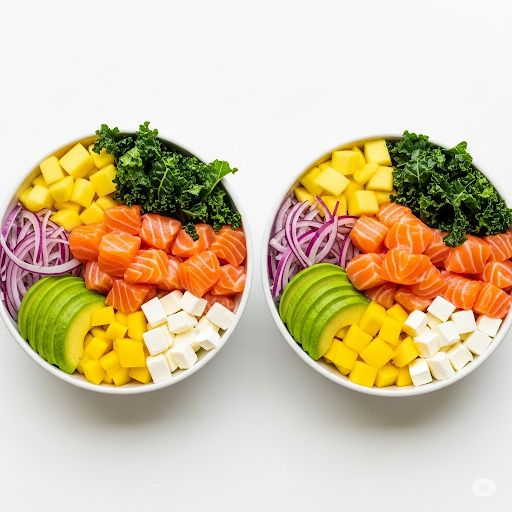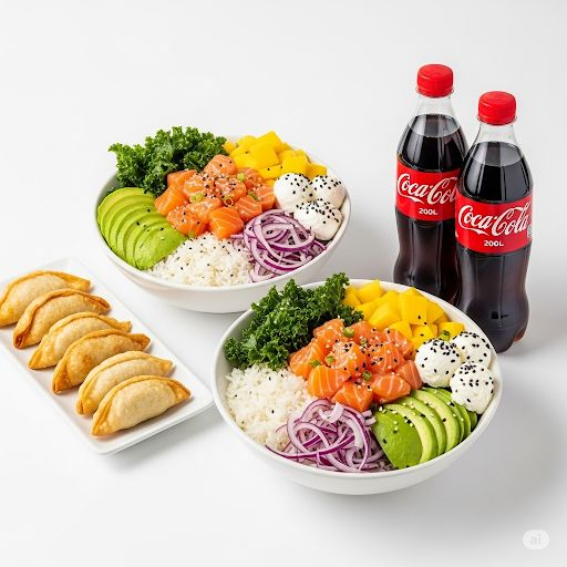 Monte 2 Pokes + Porção a escolha (14un Hot Roll ou 6 Guiozas ou 6 Mini Harumakis Queijo) + 2 Bebidas!!!