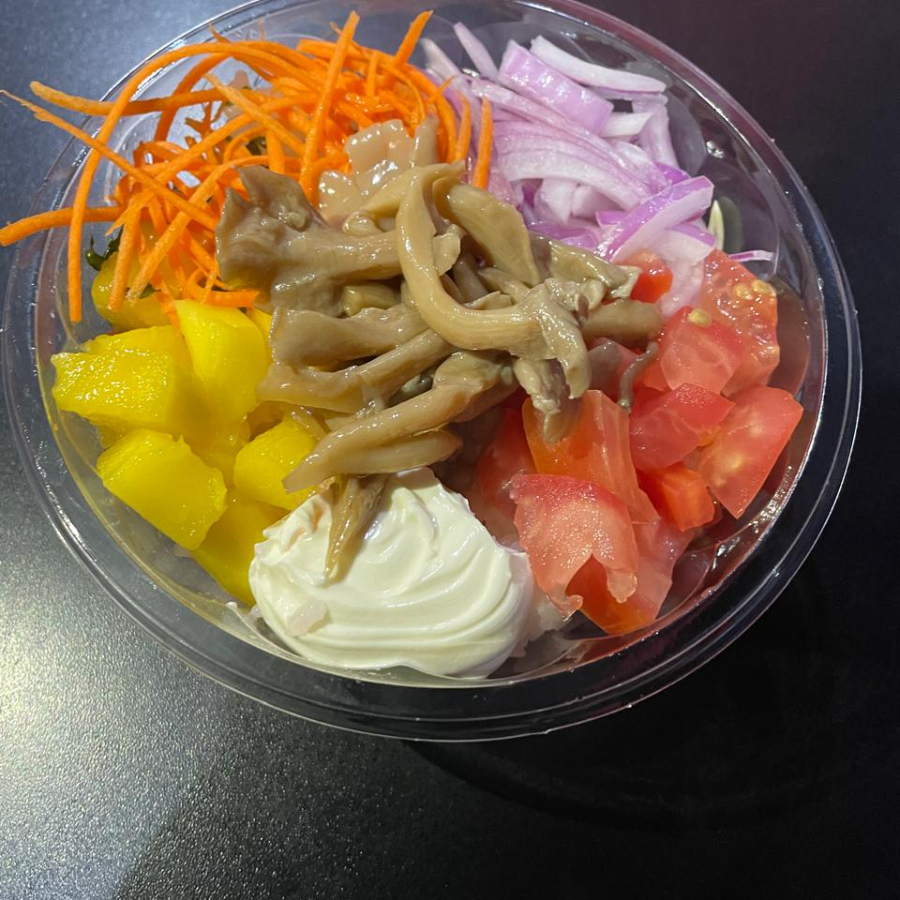 Arroz, shimeji, manga, cenoura, tomate, cebola roxa e cream cheese