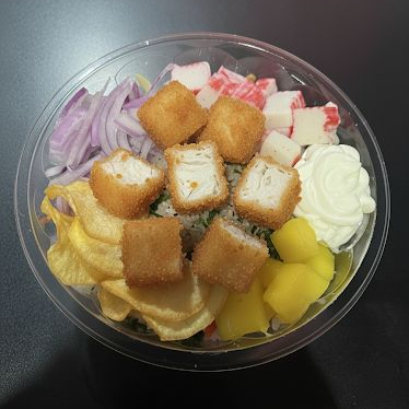 Arroz, salmão grelhado, chips de batata doce, cebola roxa, kani, manga e cream cheese