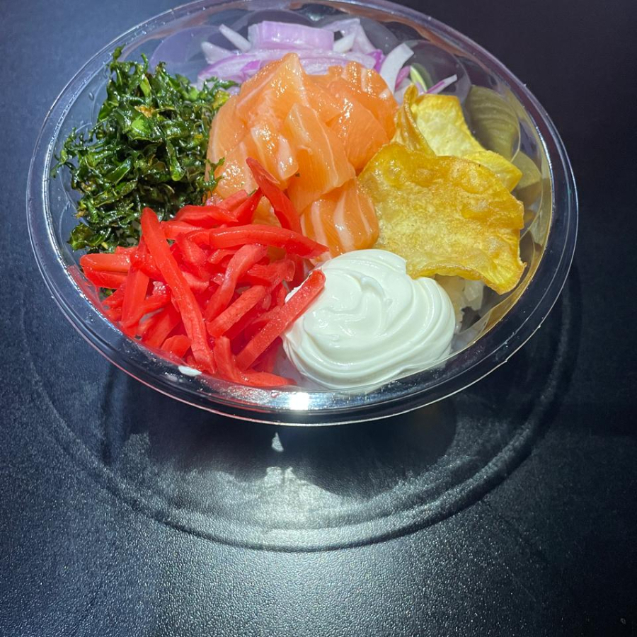 Arroz, salmão, couve crispy, sunomono, chips batata doce, cebola roxa e cream cheese