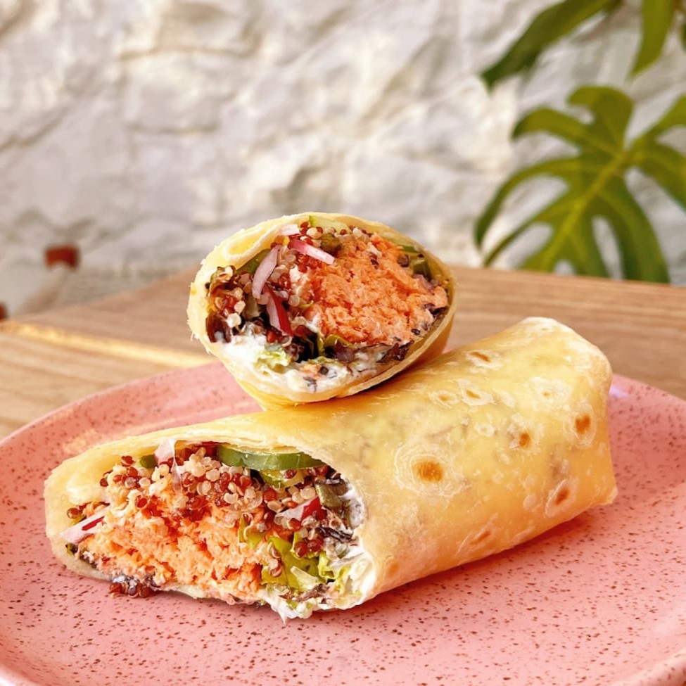 Salmão grelhado (desfiado), quinoa, sour cream, tomate, cebola roxa, pepino e mix de folhas, envoltos em wrap de tomate ou tradicional (dependendo da disponibilidade do Dia).