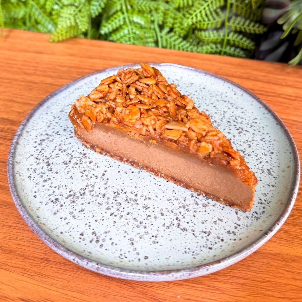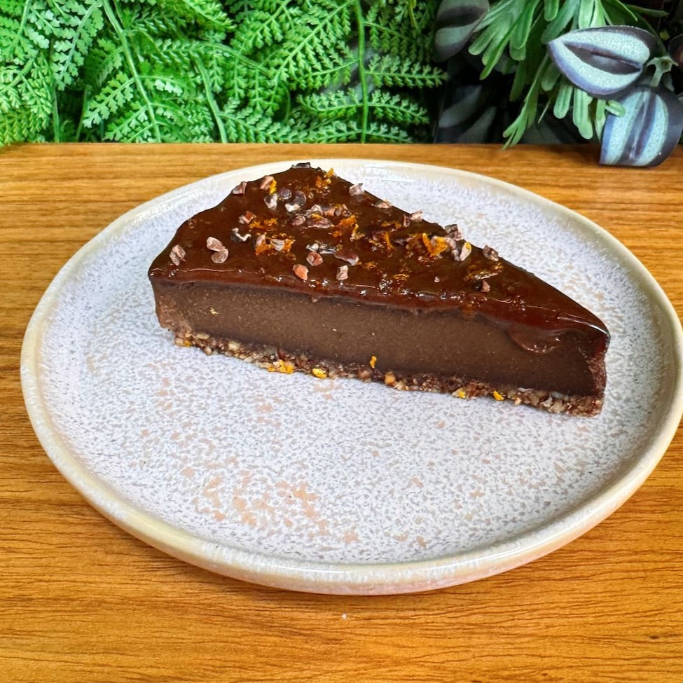 Torta feita de creme de cacau e toque cítrico de laranja, delicadamente coberta com calda de chocolate, nibs de cacau e raspas de laranja, na base nutritiva de tâmaras e amêndoas. Adoçada com melado de cana e açúcar de coco. Livre de glúten e lactose. Fatia de aprox. 90g.
