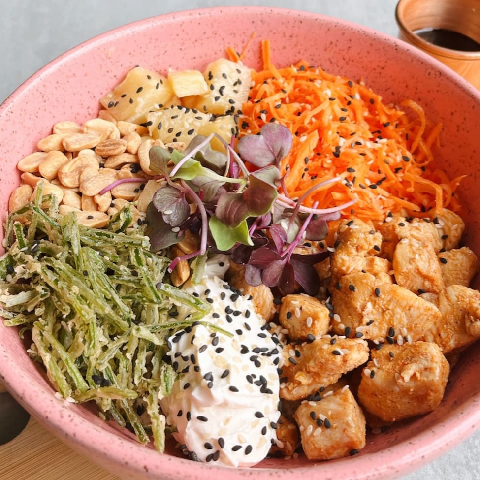 Frango grelhado em cubos (aprox. 120g), cenoura, amendoim, abacaxi grelhado, alho poró crispy, cream cheese e base de couscous com toque de limão siciliano), finalizado com gergelim. Escolha seu molho favorito!!