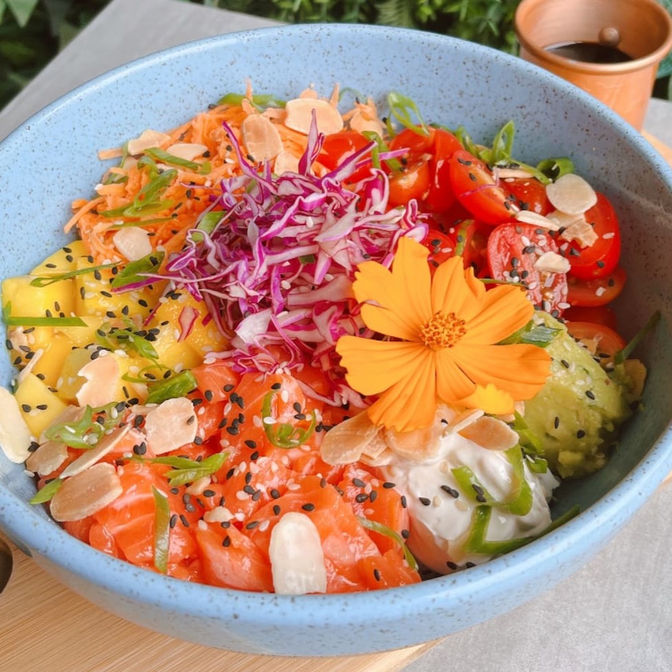 Salmão cru (aprox. 100g), creme de avocado, cream cheese, tomate cereja, cenoura, repolho roxo, manga e base de gohan ( arroz japonês) finalizado com amêndoas, gergelim e cebolinha. Escolha seu molho (teriyaki ou tarê) favorito!!
