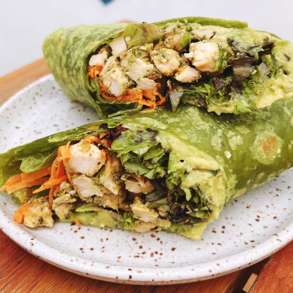 Frango grelhado com pesto, creme de avocado, cenoura e mix de folhas, envoltos em wrap de espinafre ou tradicional (dependendo da disponibilidade do Dia).