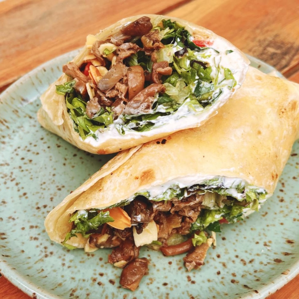 Mix de cogumelos, sour cream, tomate, amêndoas laminadas e mix de folhas, envoltos em wrap tradicional ou de espinafre (dependendo da disponibilidade do Dia).