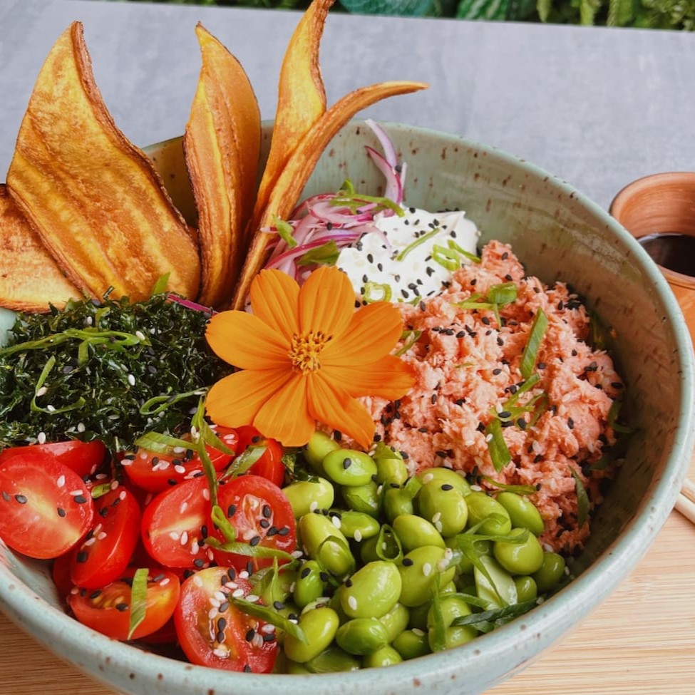 Salmão grelhado e desfiado (aprox. 120g), cream cheese, edamame, couve crispy, tomate cereja, cebola roxa, chips de banana da terra e base de gohan ( arroz japonês) gergelim e cebolinha. Escolha seu molho favorito!!