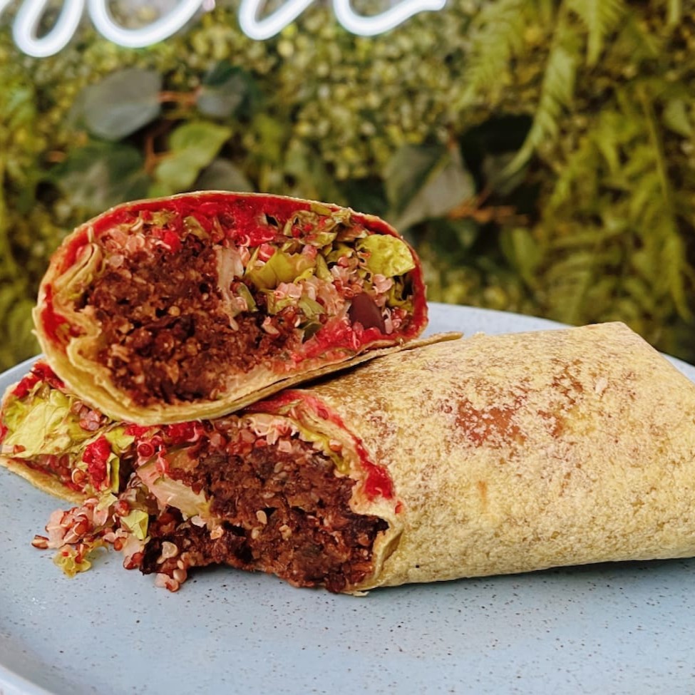 Falafel com tahine, quinoa, pink homus, azeitonas pretas, pepino e mix de folhas, envoltos em wrap de espinafre ou tradicional (dependendo da disponibilidade do Dia).