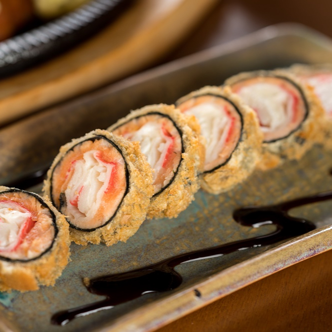 Saborosos hots rolls com uma tira de kani no recheio, envoltos em salmão grelhado e cream cheese, empanados e fritos até ficarem crocantes por fora. Uma combinação cremosa e marcante, perfeita para quem busca um sushi quente e cheio de sabor!