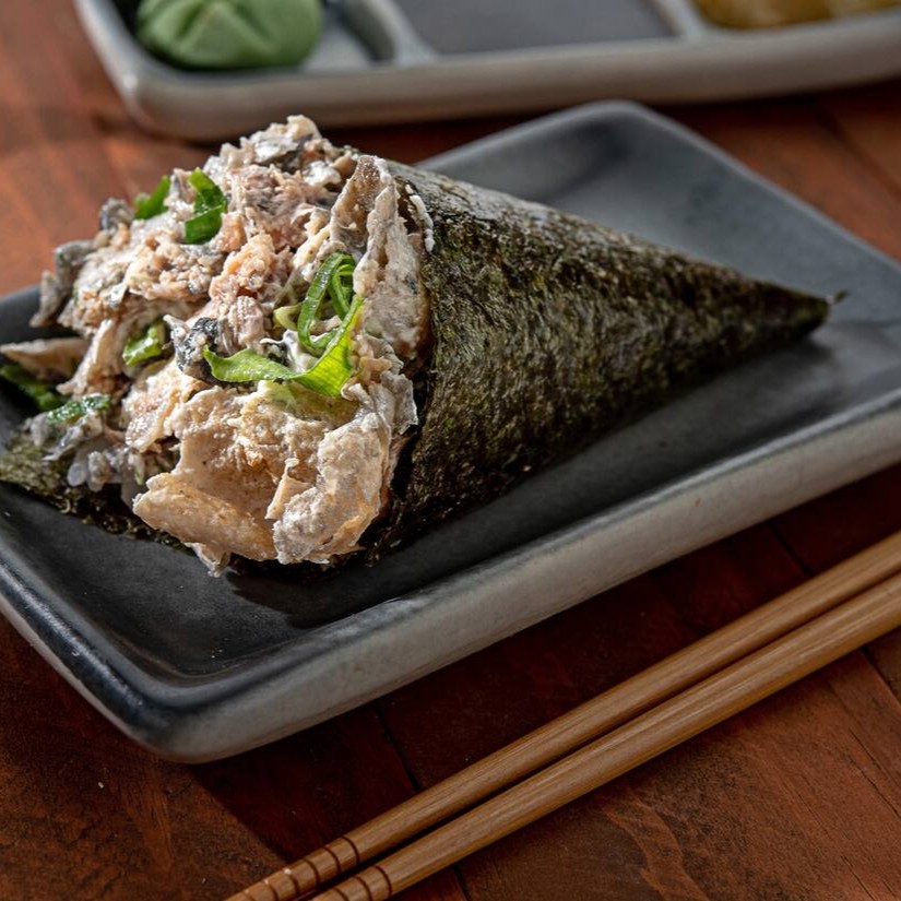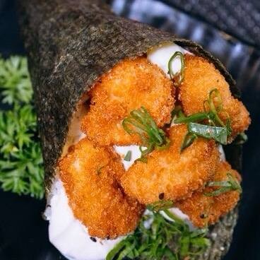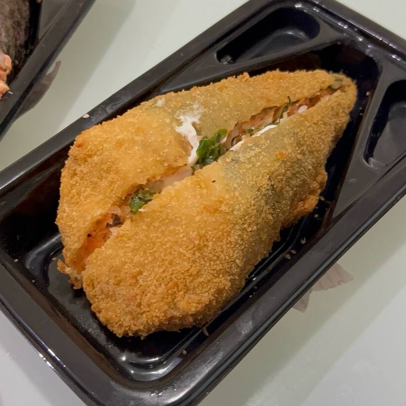 Temaki empanado, salmão grelhado, crocante por fora e cremoso por dentro.