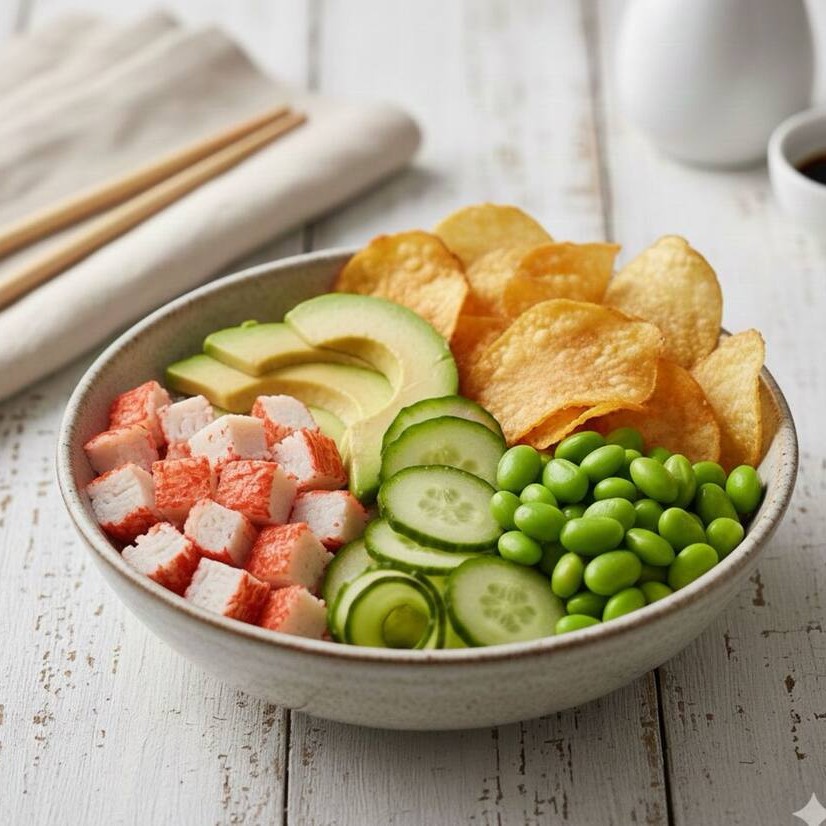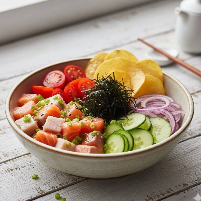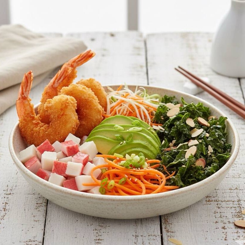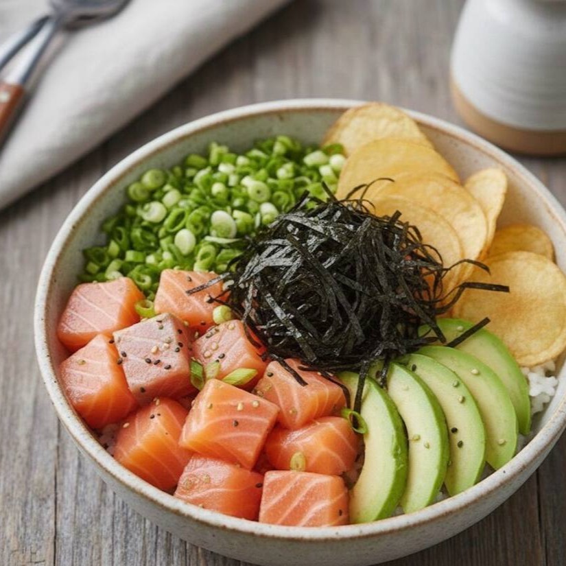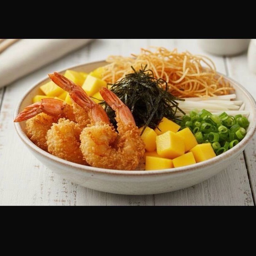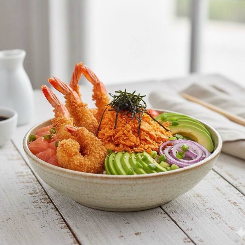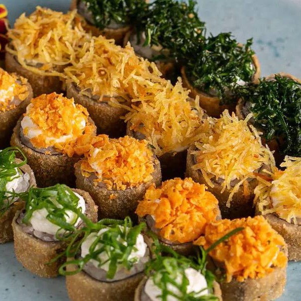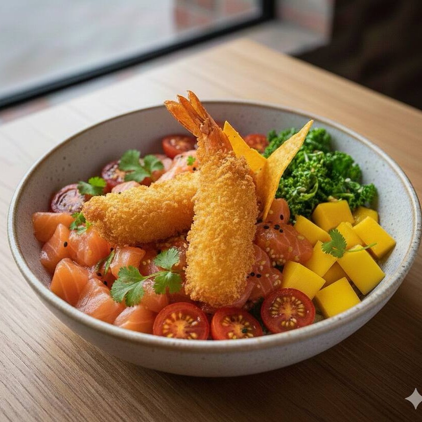 Salmão fresco e camarão suculento, combinados com cream cheese, manga, crocante de couve, Doritos, tomate cereja e base de arroz japonês.