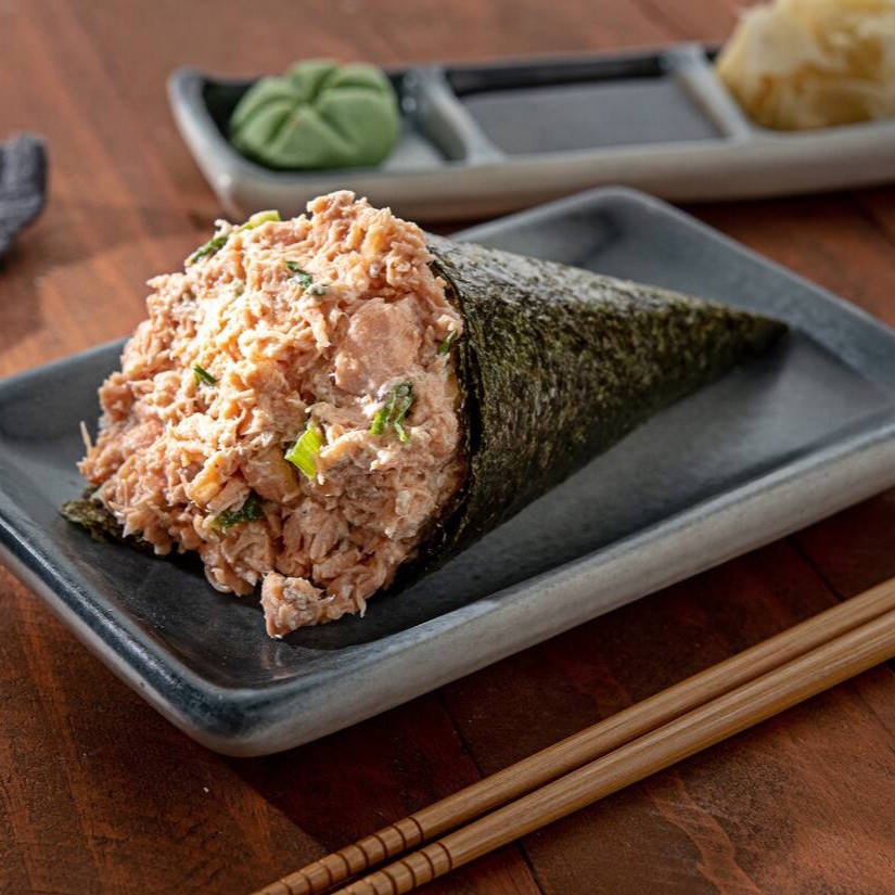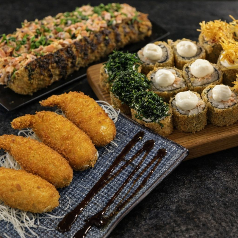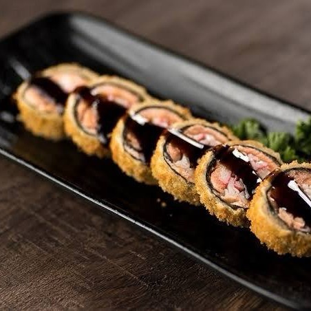 Hot roll à la carte, com recheio de salmão fresco, arroz japonês e cream cheese, envolto na alga nori e finalizado com uma folha de salmão por fora. Crocante por fora e cremoso por dentro.