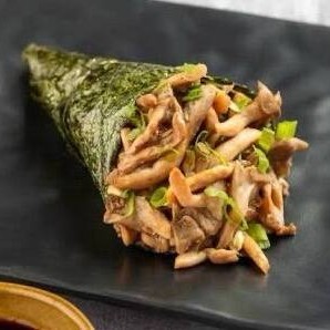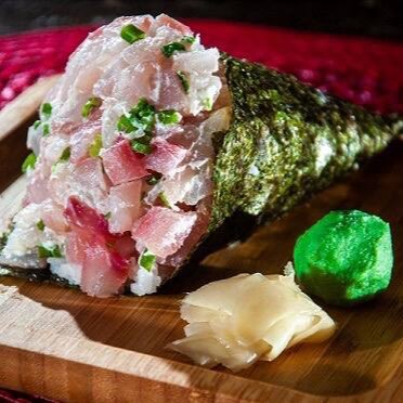 Temaki Skin: Pele de salmão crocante, arroz e nori.