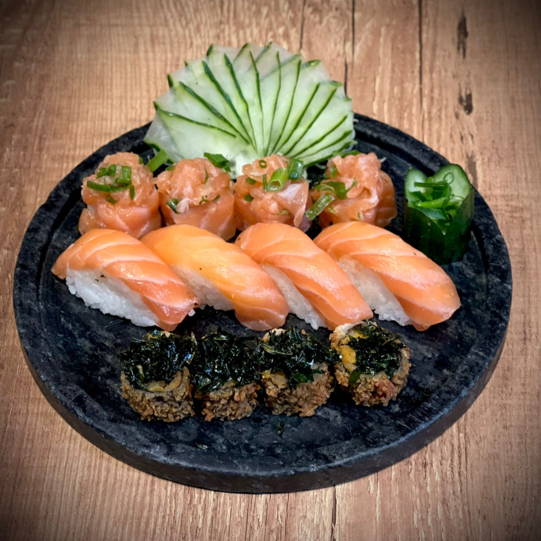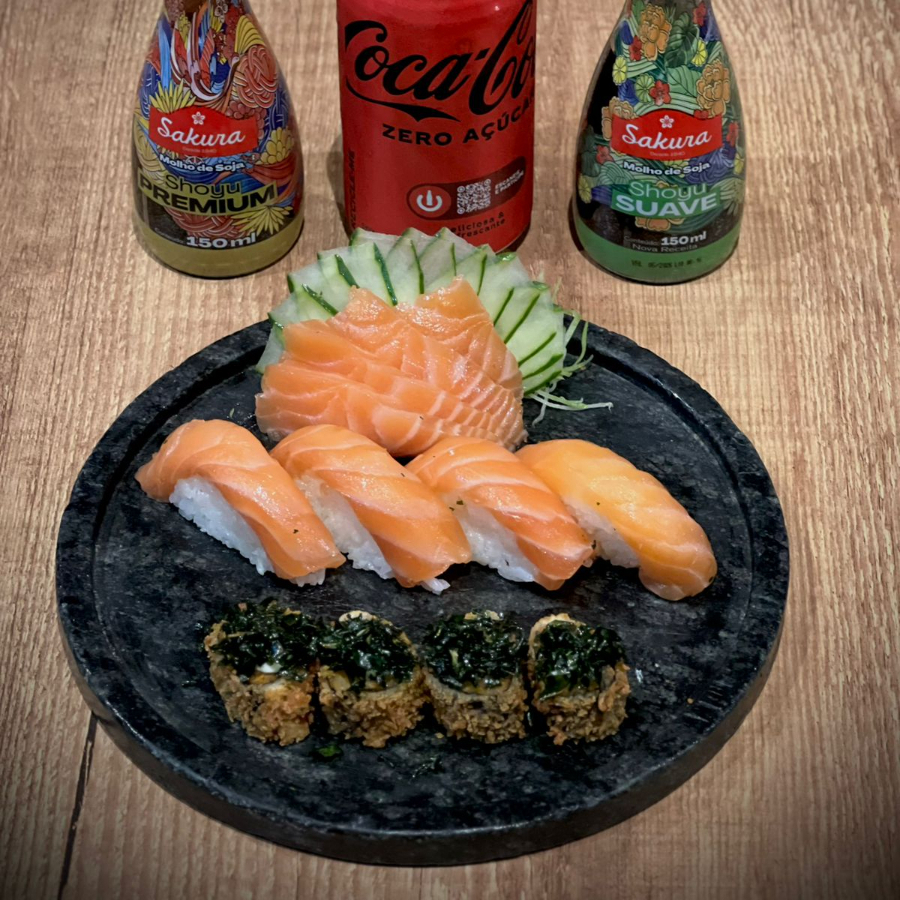 * 4 Niguiris sortidos * 4 Sashimis de salmão * 4 Hot Rolls