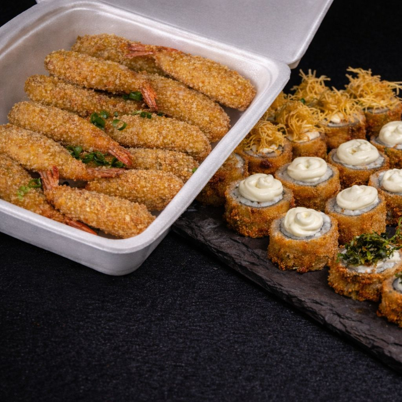 Uma combinação perfeita pra quem gosta de sabor e crocância. São 10 camarões empanados, dourados por fora e suculentos por dentro, acompanhados de 10 Hot Hool crocantes, recheados com arroz temperado e proteína selecionada, finalizados com aquele empanado sequinho e irresistível.
