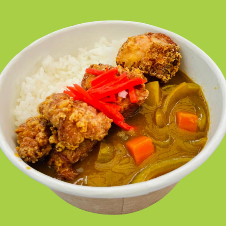 Gohan (arroz japonês) com curry cremoso com legumes cozidos, frango karaage crocante e beni shoga (gengibre em conserva). Uma explosão de sabor que une o conforto do kare à crocância do frango frito