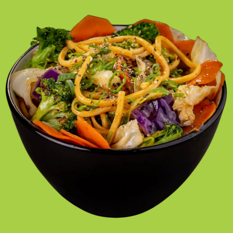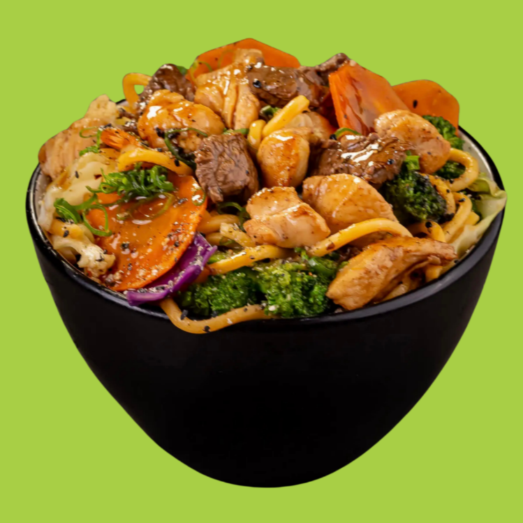 Macarrão yakisoba salteado com acelga, repolho, repolho roxo, cenoura, brócolis, peito de frango e carne bovina, envoltos no clássico molho yakisoba. Um prato completo, colorido e cheio de sabor oriental.