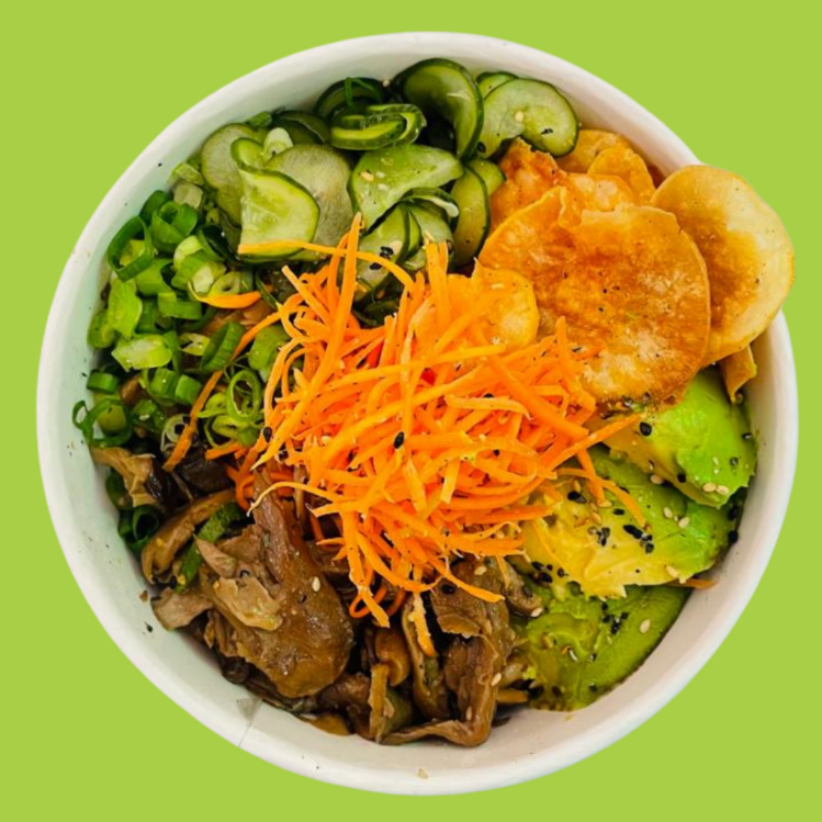 Shimeji salteado na manteiga, cebolinha, gohan (arroz japonês) abacate, chips de batata doce, cenoura e sunomono de pepino. Frescor e equilíbrio .