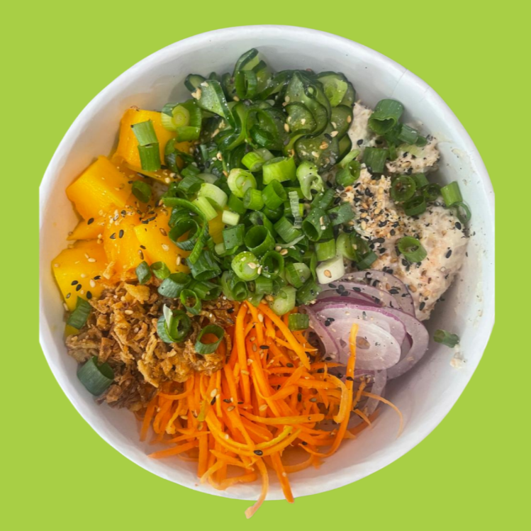 Salmão, cream cheese e cebolinha, gohan (arroz japonês, manga, cebola crispy, cebola roxa, cenoura, sunomono de pepino e cebolinha. Sabor marcante com toque crocante e refrescante.
