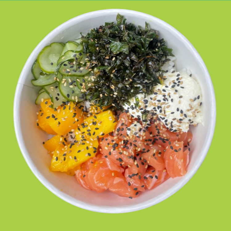 Salmão, gohan (Arroz Japonês) , manga, cream cheese, couve crispy e sunomono de pepino, gergelim torrado