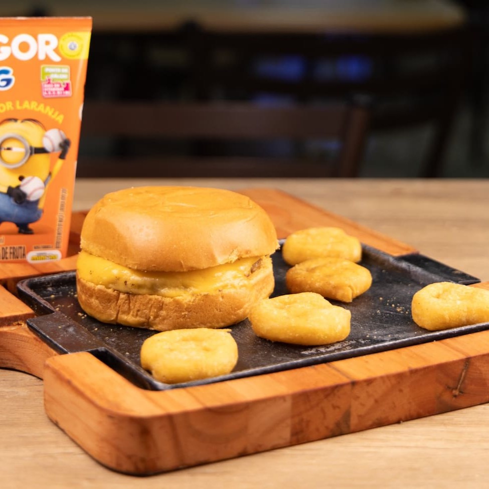 Pão, hambúrguer artesanal, cheddar, ovo, alface, tomate e molho especial + batatas fritas 150grs