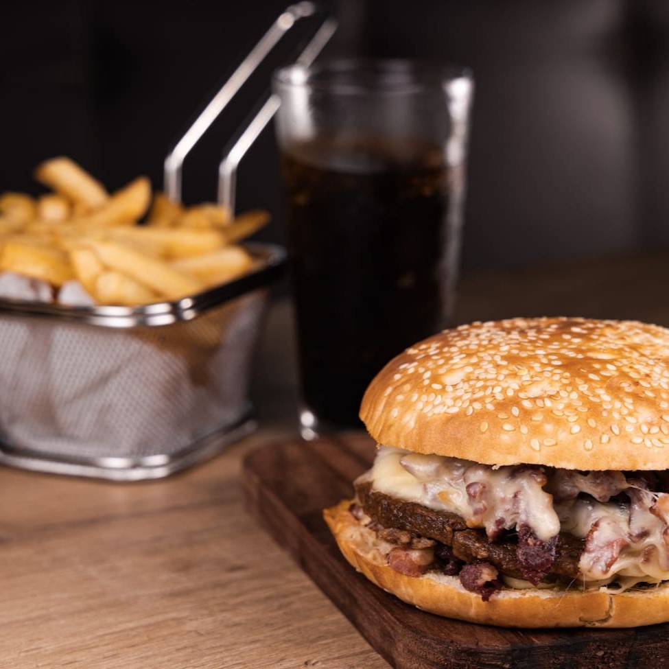 Hambúrguer artesanal, bacon frito, mussarela, maionese e presunto