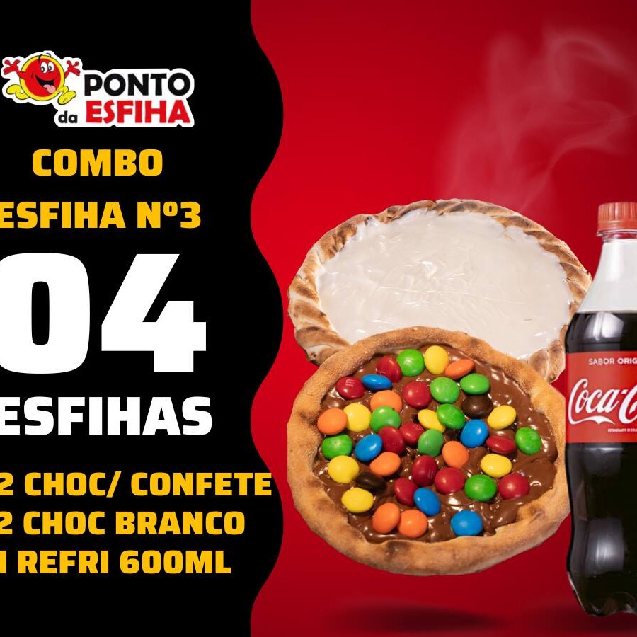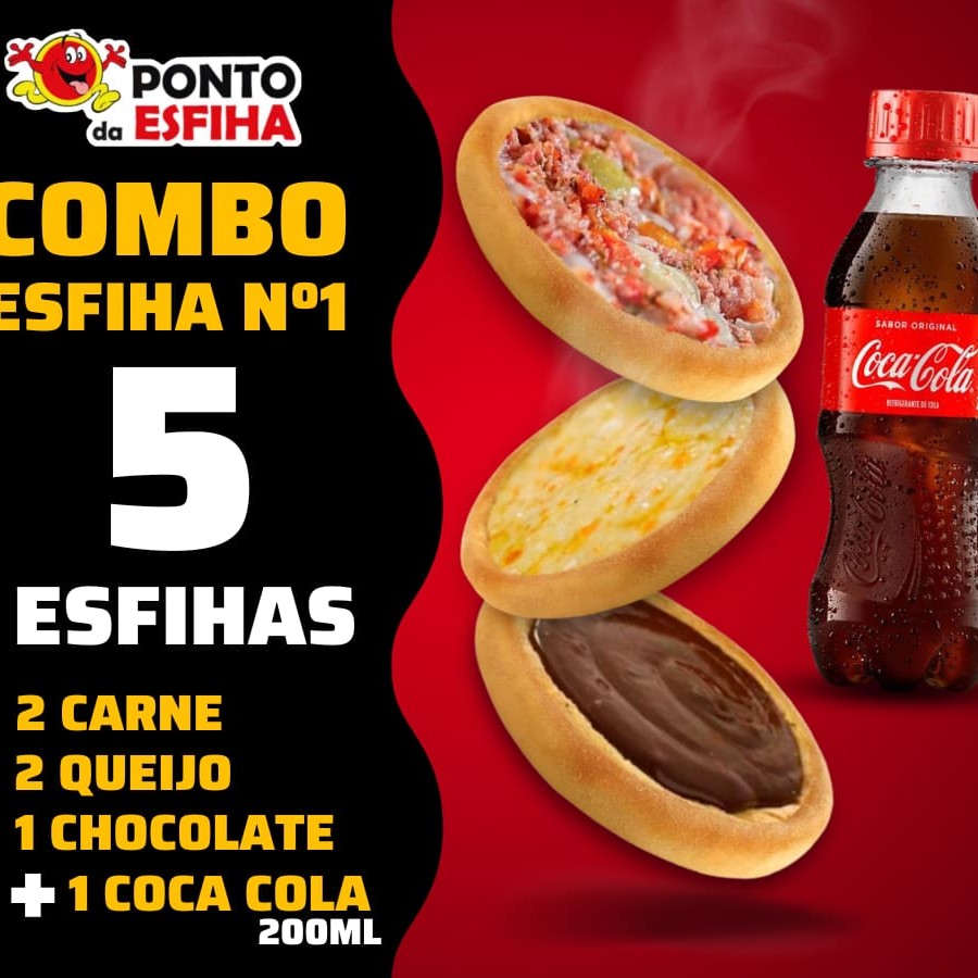 02 esfihas de carne + 02 esfihas de queijo + 01 esfiha de Chocolate + 01 Coca de 200ml