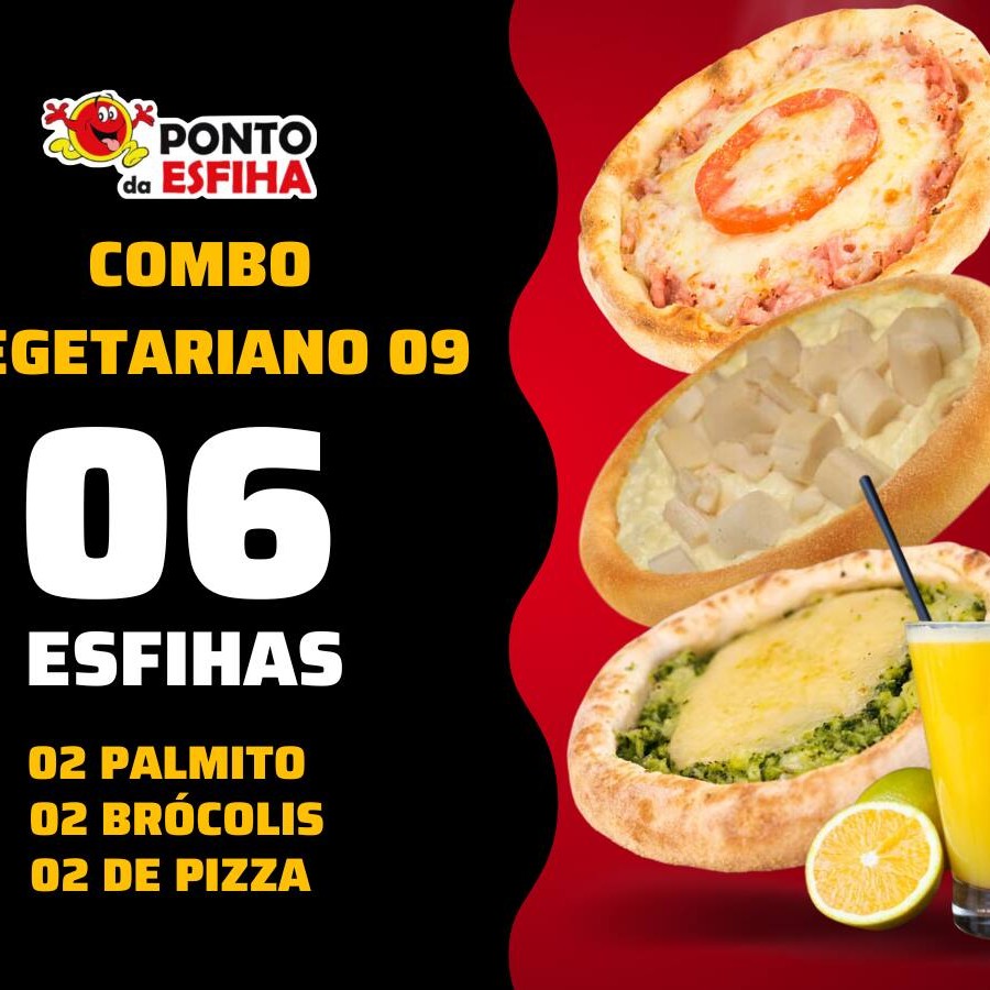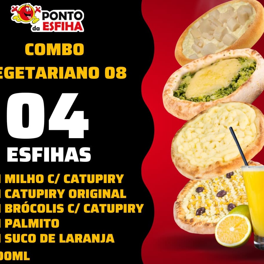 02 esfihas de palmito + 02 esfihas de brócolis + 02 esfihas de pizza + 01 suco de natural de laranja 300ml