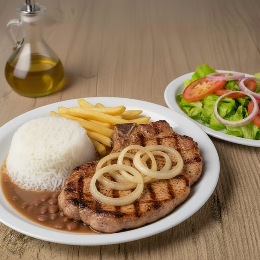 Acompanha: arroz, feijão carioca, bisteca grelhada, alface e batata