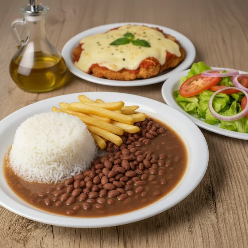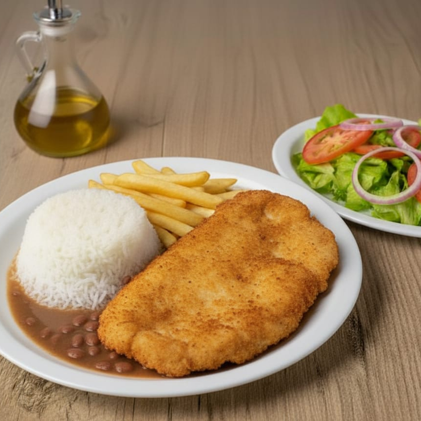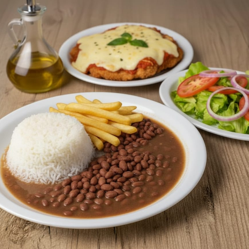 Acompanha: arroz, feijão carioca, contra filé a milanesa, alface e batata