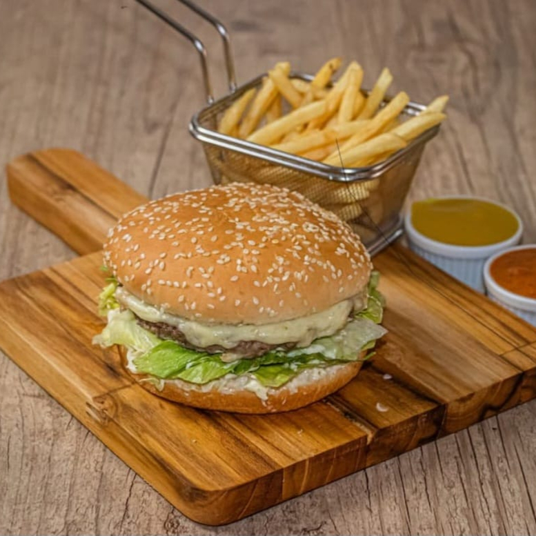 Hambúrguer tradicional, queijo, alface, tomate e maionese.
