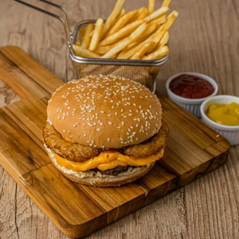 Hambúrguer, onion rings, cheddar, barbecue, e maionese. (não acompanha batata)
