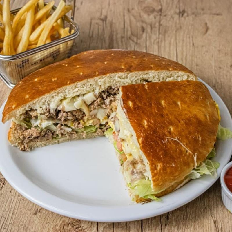 Acompanha: Salada, presunto, ovo, bacon, mussarela, e palmito.