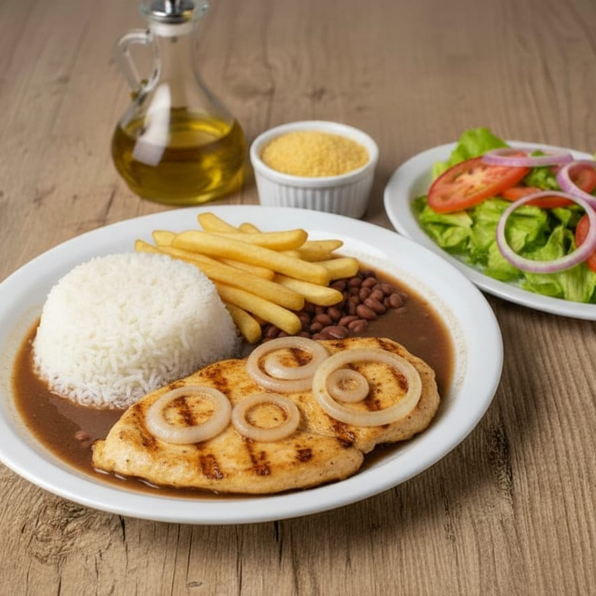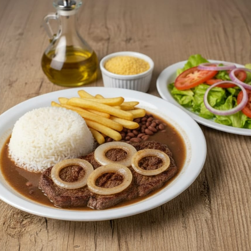 Acompanha: arroz, feijão carioca, contra filé acebolado, alface e batata
