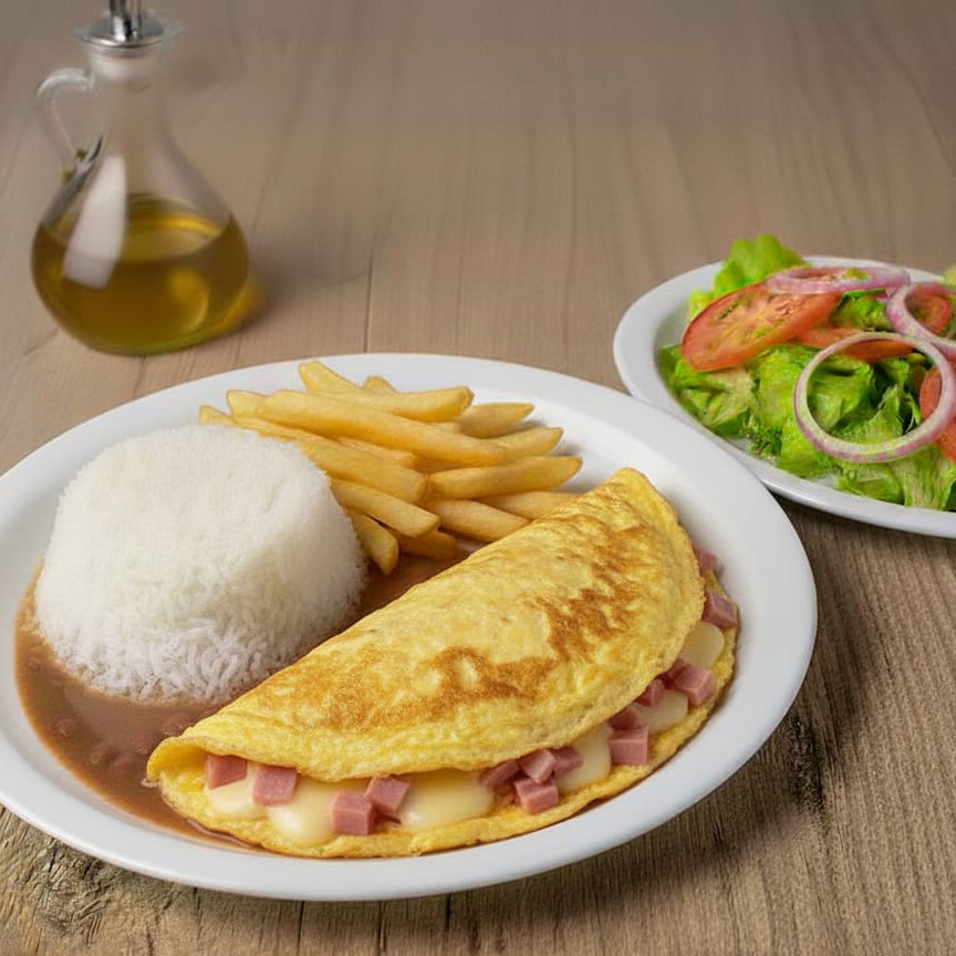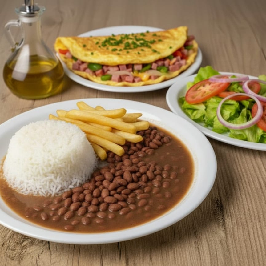 Acompanha: arroz, feijão carioca, omelete completa, alface e batata