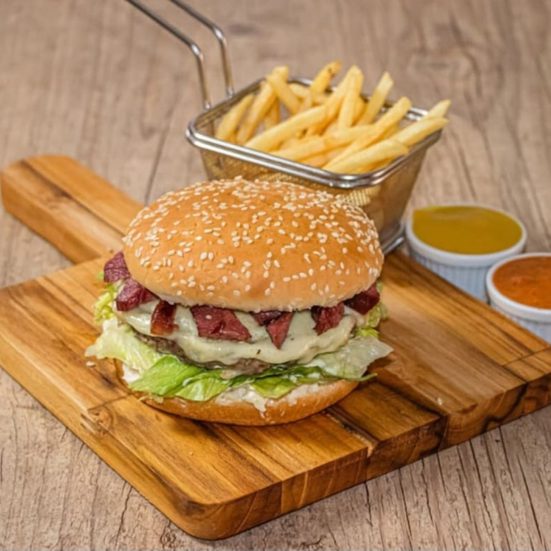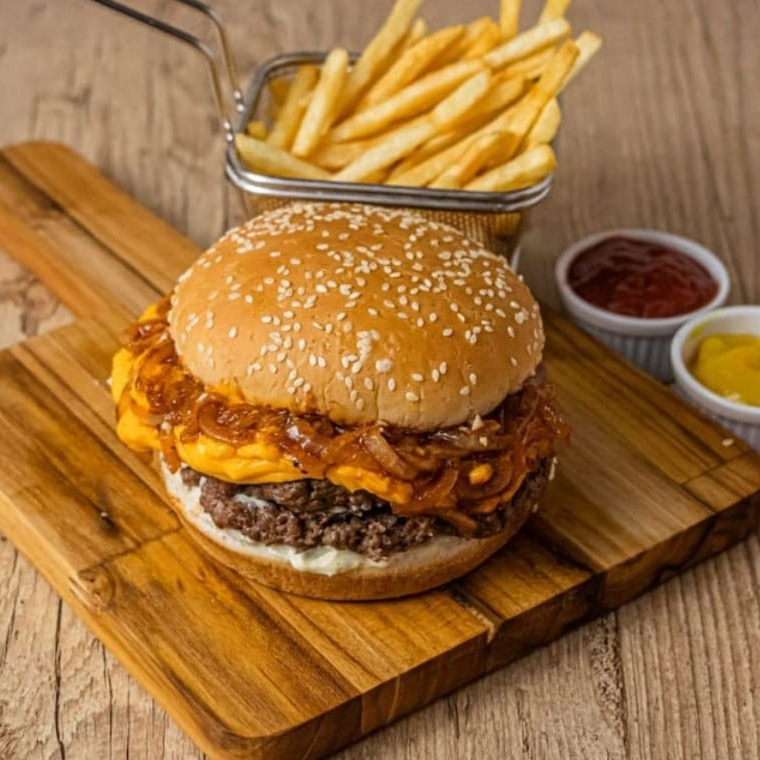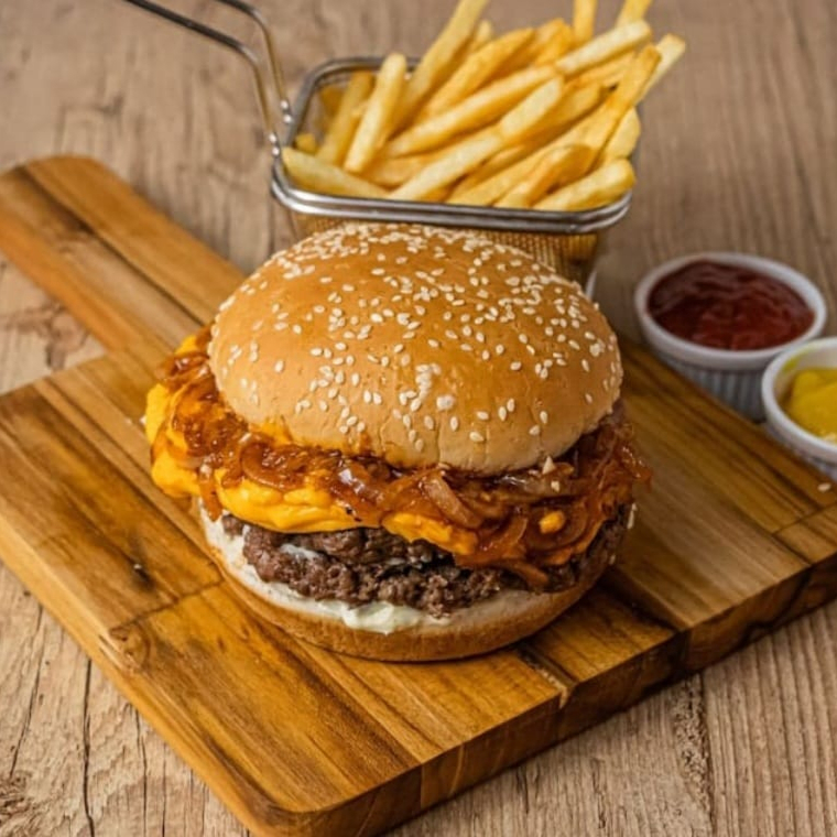 Hambúrguer tradicional, cheddar, cebola frita e barbecue.