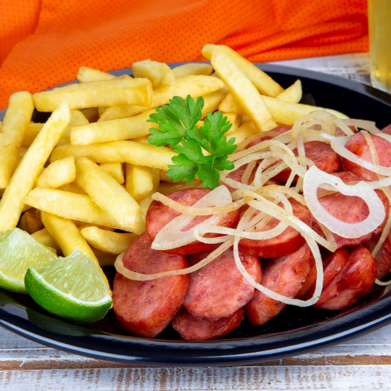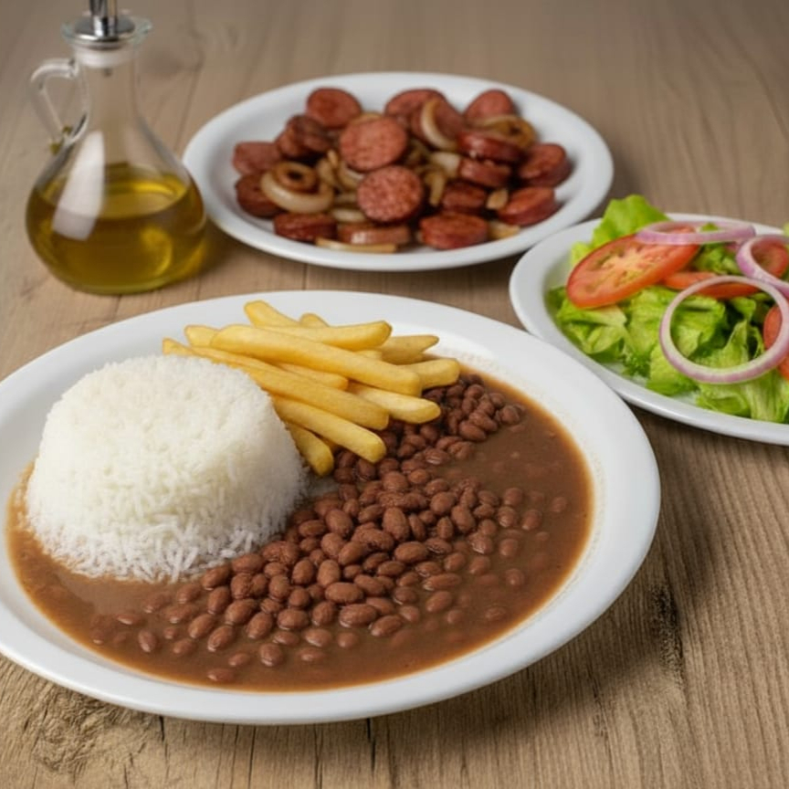 Acompanha: arroz, feijão carioca, calabresa acebolada, alface e batata.