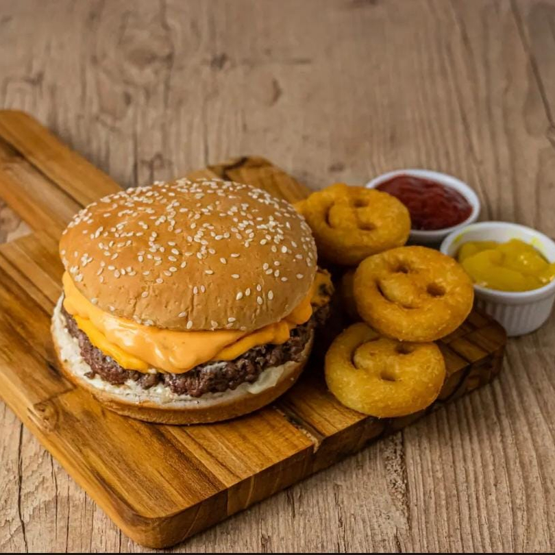 Hambúrguer tradicional, queijo, cheddar, billy jack, alface, maionese e 4 batata smile.