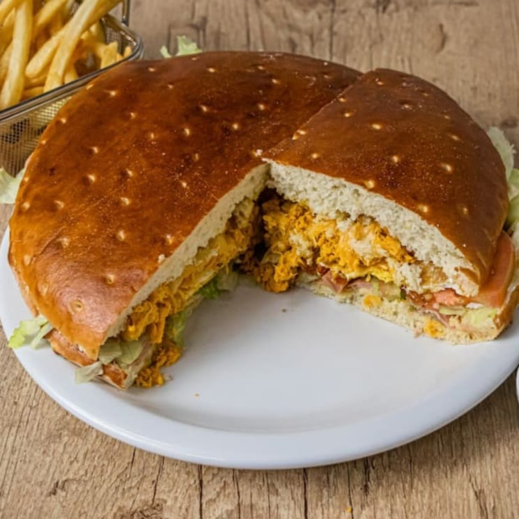 Acompanha: Hambúrguer, presunto, salada, maionese e ovo.