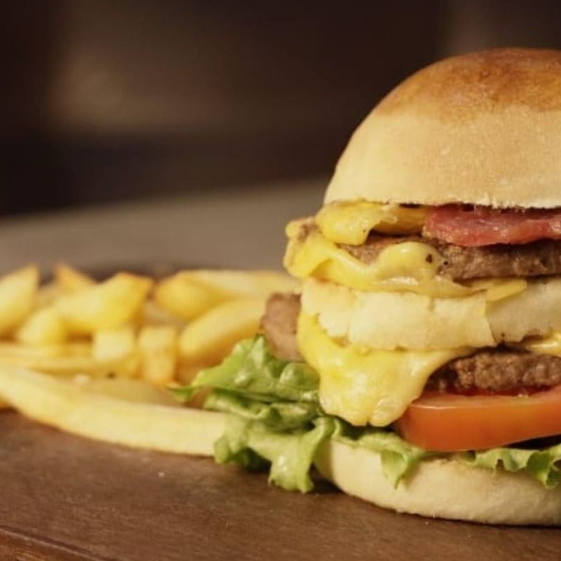 Pão de brioche, 2 hambúrgueres artesanal 120g, queijo cheddar e bacon + fritas