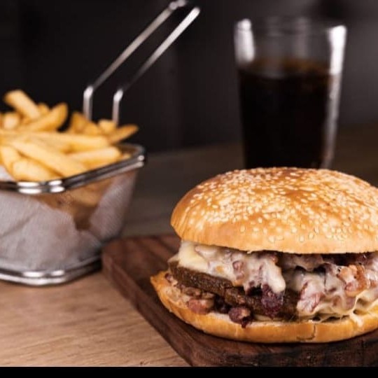 Pão de brioche, hambúrguer artesanal 120g, queijo, bacon e maionese + fritas
