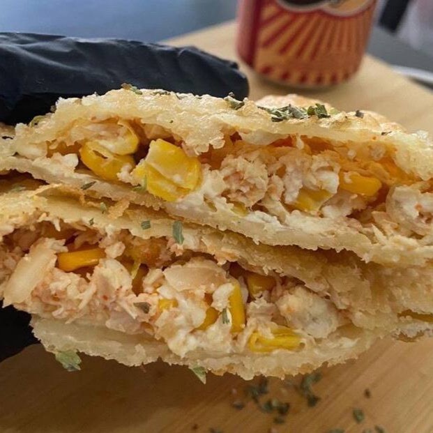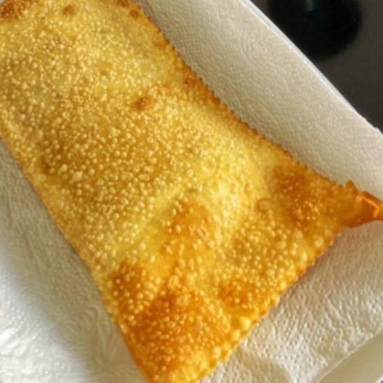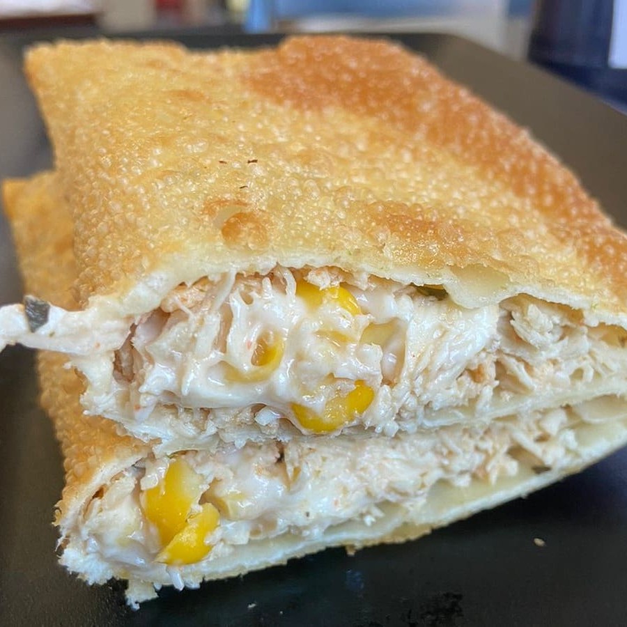 Pastel de frango desfiado com requeijão cremoso tirolez, crocante, bem sequinho e recheado. obs: não acompanha milho